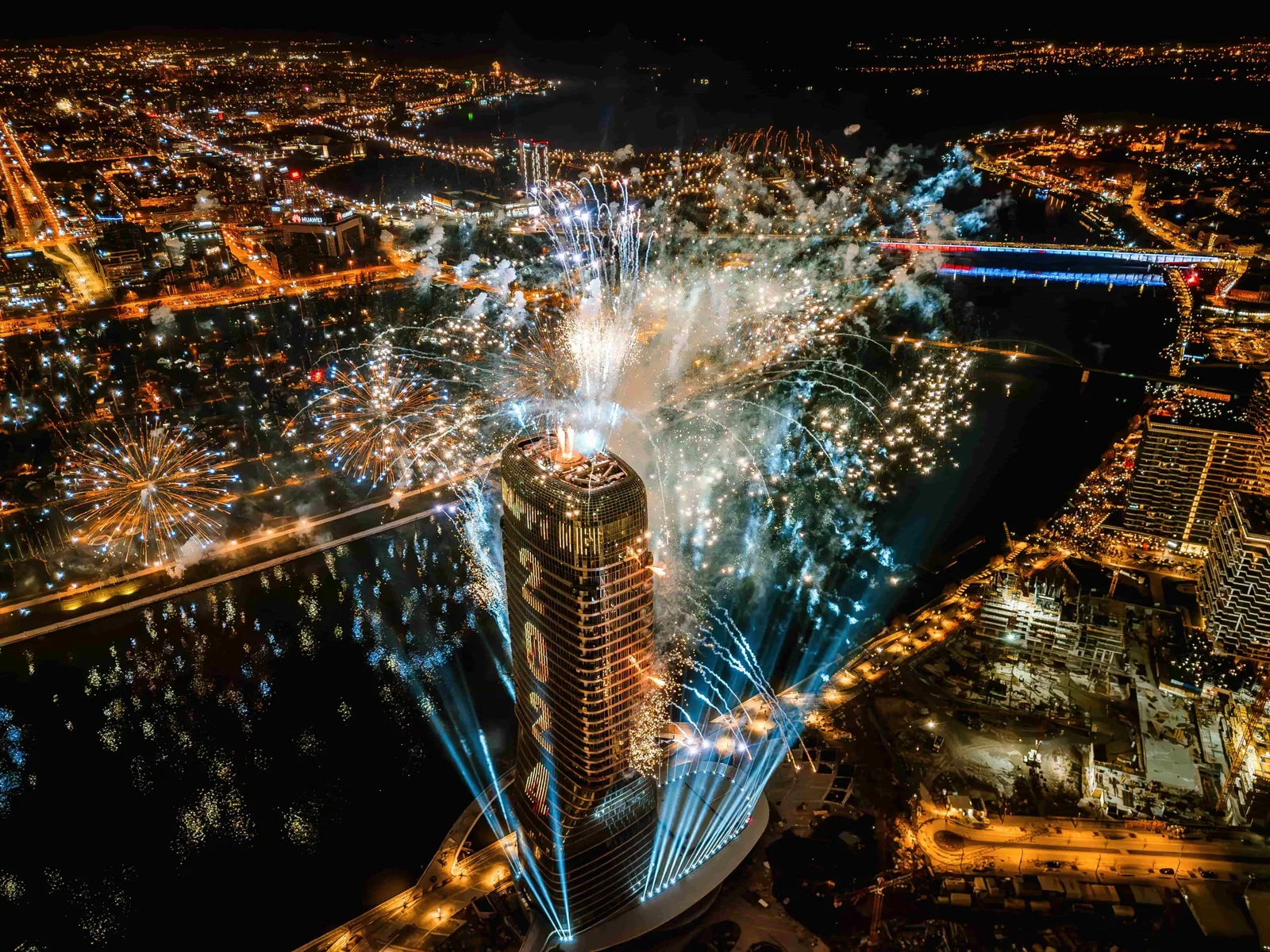In addition to being fired from as many as 20 floors of the Kula Belgrade, the new symbol of the Serbian capital, a multi-minute fireworks were also arranged on the entire New Belgrade riverbank of Sava, from Gazela and the Old Sava Bridge. This impressive visual show was further enhanced by the music composed specially for this occasion, with the national musical motifs intertwining it.