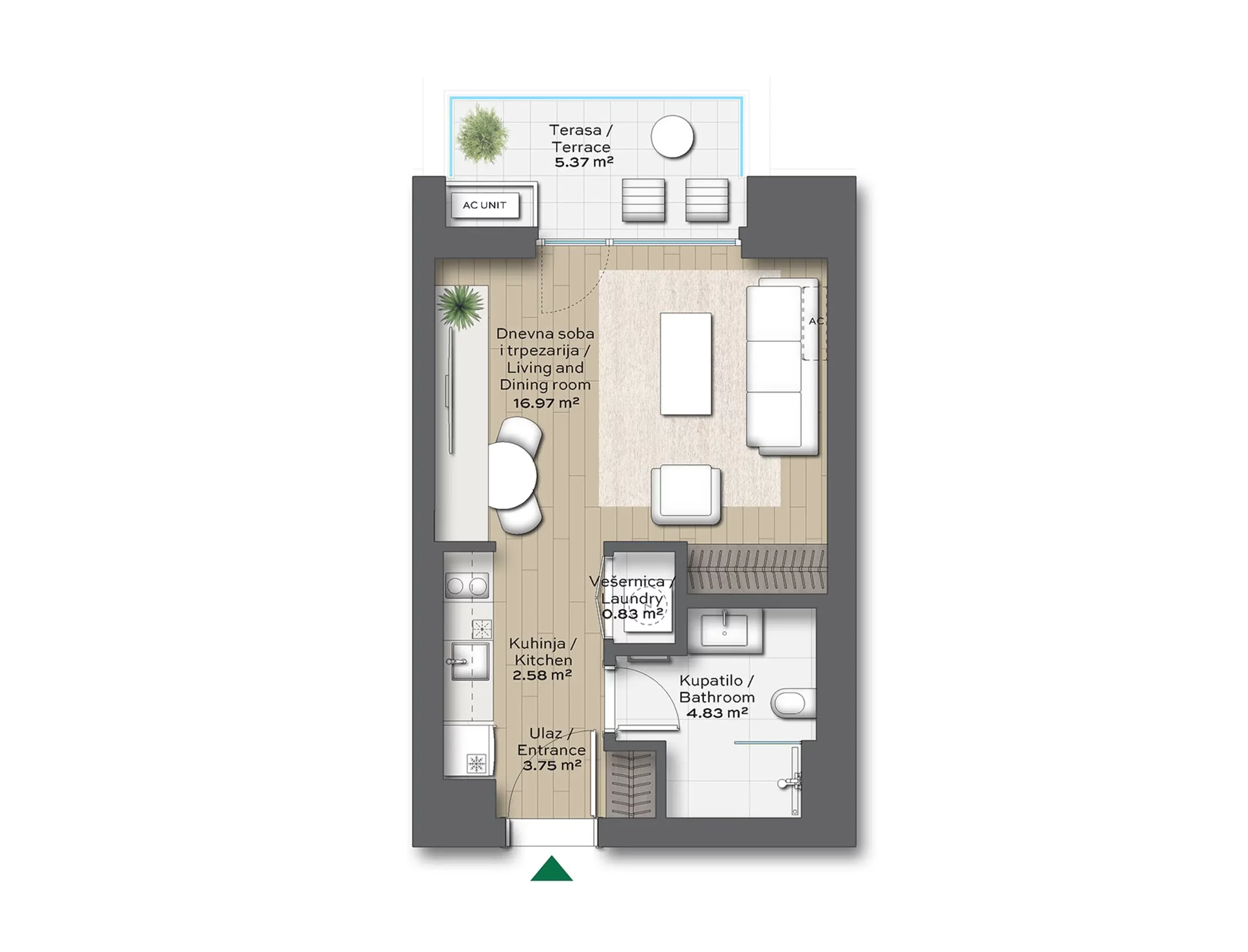 BW Oda offers a wide selection of apartments, ranging from efficient studios to luxurious four‑bedroom duplex penthouses – with designs that combine functionality, aesthetics, and comfort. Every unit features a terrace, an open‑plan kitchen, and high-set window panes that flood the interior with natural light, offering views of Bristol Park, Sava Square, the Belgrade Waterfront skyline, or the landscaped courtyard.
