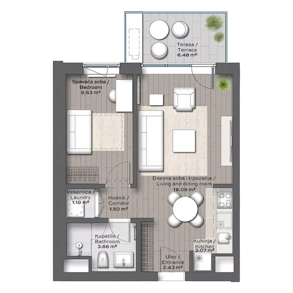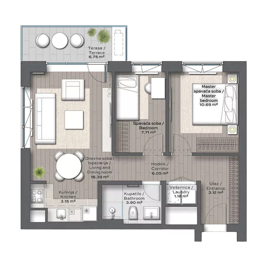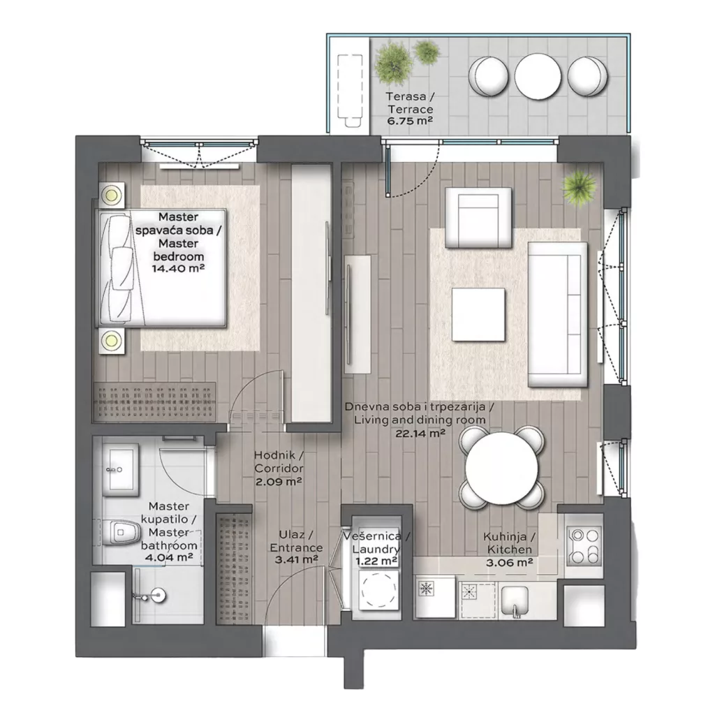 BW Rima is a unique environment for a healthier and more active lifestyle. A spacious common yard, which will be separated from the street by a hedge, forms the green heart of the complex, where there will be a playground for children, a bocce ball court for adults, and a relaxation area for residents. The majestic Sava Park, just one block away from the building, offers a range of sports and recreational facilities for people of all ages and interests, while the nearby 1.8-kilometre Sava Promenada offers the opportunity to run, ride a bike or take a stroll along the river. We must not forget the state-of-the-art sports centre that will allow residents to enjoy sports activities all year round.