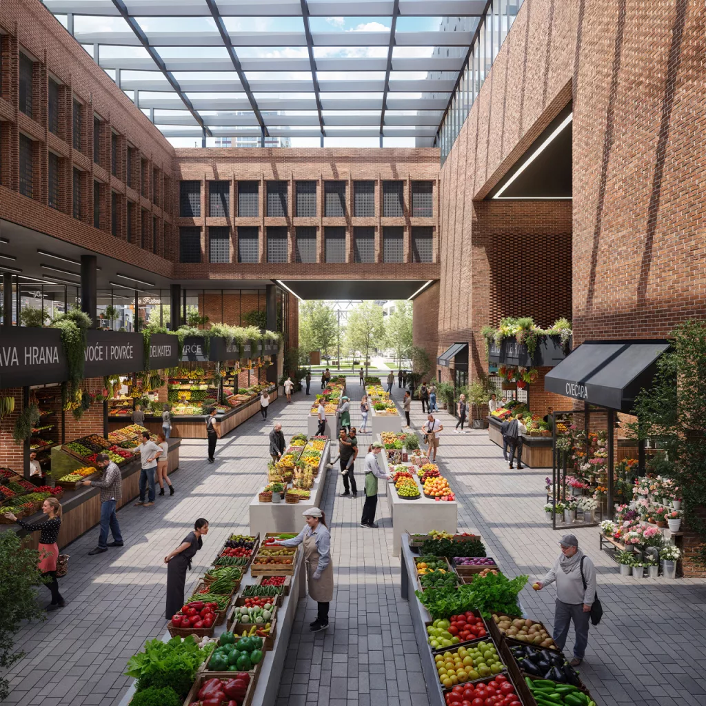 Several entrances will lead to the naturally lit central hall, which will be the “heart” of the facility. This market is not just a place to buy fresh produce and quality delicacies – it is designed to provide a complete experience for all the senses. Visitors can eat “something off their feet” or sit in the restaurant, drink coffee or drinks, and relax in the pleasant atmosphere and warmth of the unique ambience.