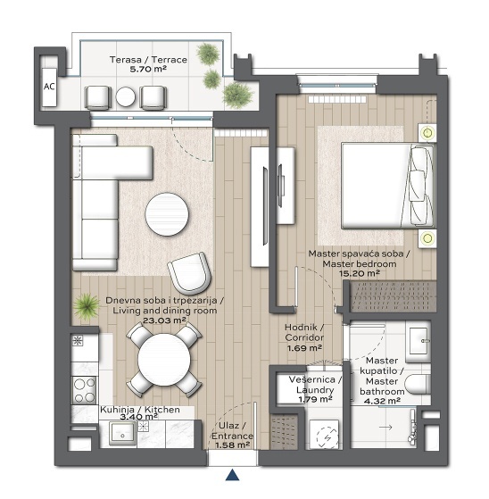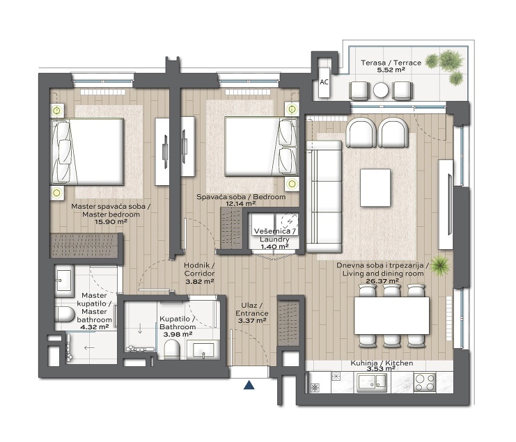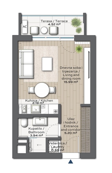 The possibilities for recreation don’t end here since the nearby Sava Park offers them in abundance – from a multifunctional sports court, through table tennis or yoga on groomed lawns, to a 700-metre-long jogging track. Children will have endless fun on the playground, which includes unique waterplay.