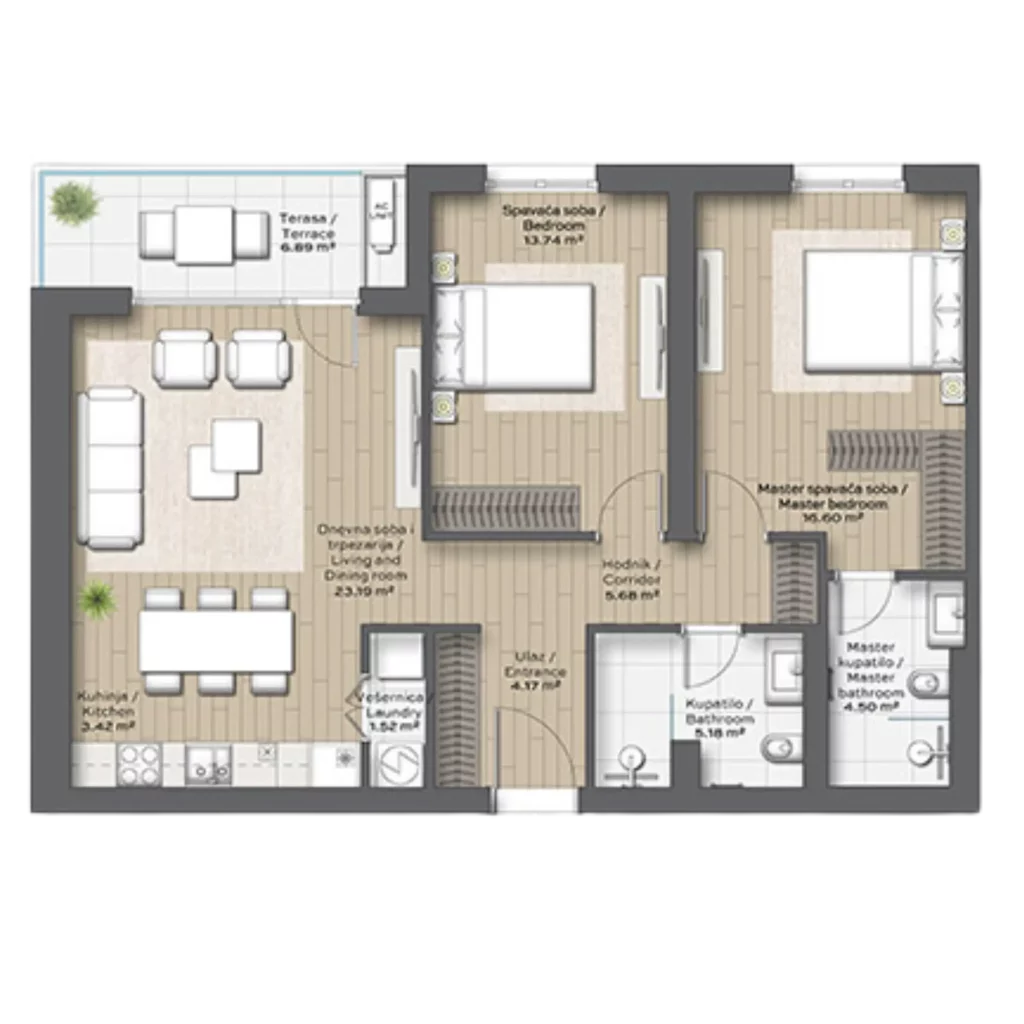 A two-bedroom apartment in the BW Sava building covers a total area of 84.89 m². It consists of two bedrooms, a living room with dining area, a kitchen, two bathrooms, a laundry room, and a terrace.