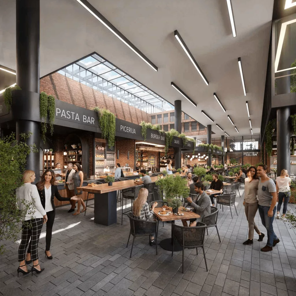 Several entrances will lead to the naturally lit central hall, which will be the “heart” of the facility. This market is not just a place to buy fresh produce and quality delicacies – it is designed to provide a complete experience for all the senses. Visitors can eat “something off their feet” or sit in the restaurant, drink coffee or drinks, and relax in the pleasant atmosphere and warmth of the unique ambience.